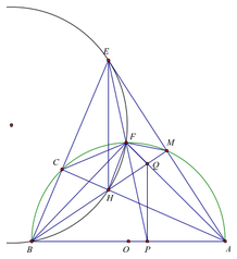 c) Đường tròn ngoại tiếp tam giác BEH cắt nửa đường tròn $(O)$ tại F, tia EF cắt AB tại P, hai đường thẳng BM và AF cắt nhau tại Q. Chứng minh PQ $\bot$ AB.