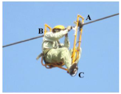 Năm 2011, kỹ sư Nguyễn Trí Hiếu, người Quảng Ngãi, đã sáng chế ra chiếc xe đu dây phục vụ công nhân điện lực di chuyển trên dây điện cao thế. Khi ở vị trí cân bằng, chiếc xe và đường dây điện sẽ cùng nằm trên một mặt phẳng vuông góc với mặt đất. Xe được cấu tạo bởi khung xe có gắn hai Puly tại vị trí A và B cách mặt đất lần lượt là 20m và 19,9m (như hình). Xe đu dây di chuyển giống xe đạp, được kết hợp dây xích, líp, đĩa, bàn đạp, phanh...; bàn đạp đặt tại vị trí $C$.