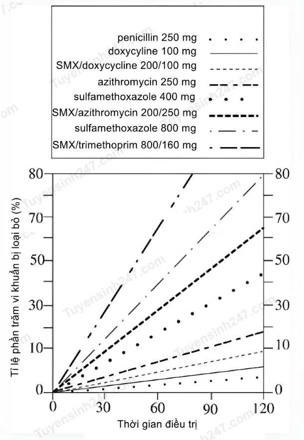 So sánh các đường thể hiện hiệu quả diệt khuẩn của các loại thuốc kháng sinh trong biểu đồ để suy ra