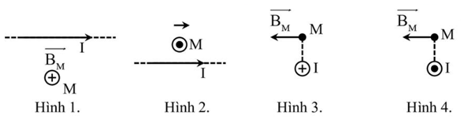 Cho các hình vẽ dưới đây, hình nào chỉ không đúng hướng của vectơ cảm ứng từ tại M gây bởi dòng điện trong dây dẫn thẳng dài vô hạn?