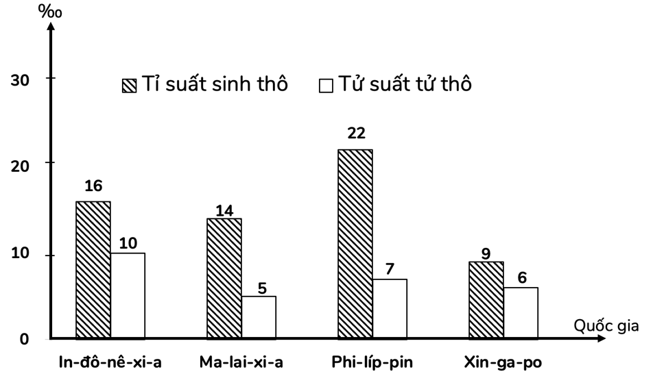 Cho biểu đồ: Tỉ suất sinh thô và tỉ suất tử thô của một số quốc gia năm