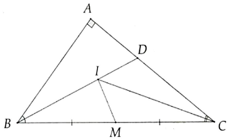 Cho tam giác $ABC$ vuông tại $A$, $AB = 6cm,\,\, AC = 8cm$, đường phân giác $BD$. Tia phân giác của $\angle C$ cắt $BD$ tại $I$. Gọi $M$ là trung điểm của $BC$. Chứng minh $\angle BIM = 90{^\circ}$