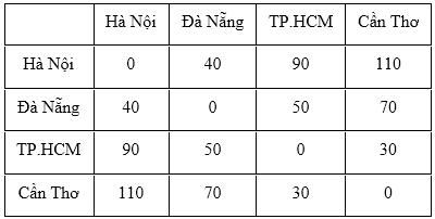 Nam và ba người bạn lên kế hoạch cho một chuyến đi phượt xuyên Việt, ghé thăm 4 thành phố: Hà Nội, Đà Nẵng, Thành phố Hồ Chí Minh (TP.HCM) và Cần Thơ. Họ xuất phát từ Hà Nội, đi qua tất cả các thành phố còn lại đúng một lần rồi quay về Hà Nội. Bảng chi phí nhiên liệu (tính bằng lít xăng) giữa các thành phố như sau:
