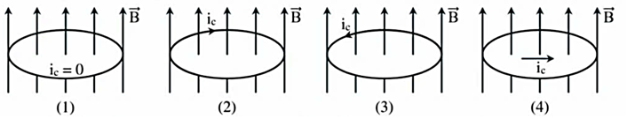 Một vòng dây đặt cố định trong từ trường đều. Khi độ lớn cảm ứng từ B giảm thì hình vẽ nào xác định đúng chiều dòng điện cảm ứng?