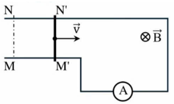 Thanh dẫn MN trượt trong từ trường đều như hình vẽ. Biết B = 0,3T thanh MN dài 40 cm, vận tốc 2 m/s điện kế có điện $R = 3\Omega$. Cường độ dòng điện và chiều của dòng điện trong thanh M’N’ là