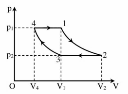 Một lượng khí lý tưởng thực hiện một chu trình như sau: Từ trạng thái 1 có thể tích V1 = 10 lít áp suất p1 = 4.105 Pa nhiệt độ T1 = 600K dãn nở đẳng nhiệt sang trạng thái 2 có thể tích V2 = 2V1 rồi tiếp tục biến đổi sang trạng thái 3 và 4 rồi trở về thái 1 như đồ thị. Biết từ trạng thái 3 sang trạng thái 4 là quá trình đẳng nhiệt.