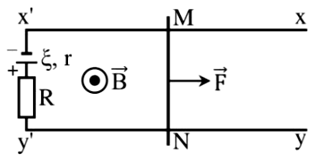 Cho thanh dẫn điện MN = 15 cm đặt nằm ngang trên hai thanh ray dẫn điện x’x, y’y như trên hình