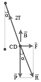 - Xác định góc lệch so với phương thẳng đứng của dây treo $\alpha:\tan\alpha = \dfrac{F}{P} = \dfrac{BI\mathcal{l}}{mg}$