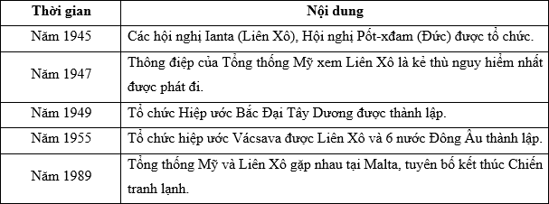 | a) Bảng tư liệu đề cập quá trình hình thành, phát triển và chấm dứt của Chiến tranh lạnh. | ||