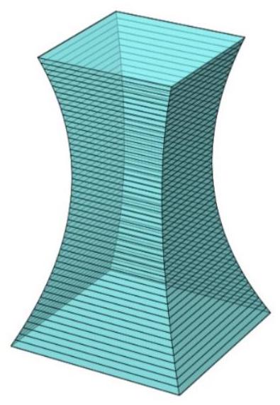 Một kiến trúc sư chịu trách nhiệm thiết kế một tòa nhà cao 40 m. Mặt cắt ngang tại mọi độ cao, vuông góc với trục thẳng đứng, luôn là một hình vuông. Mặt đáy tòa nhà là hình vuông có cạnh $L_{0} = 18m$, mặt đỉnh là hình vuông có cạnh $L_{40} = 18m$. Mặt cắt ngang tại vị trí hẹp nhất của tòa nhà: Hình vuông có cạnh $L_{\text{min}} = 13m$. Mặt cắt của tòa nhà theo mặt phẳng đứng chứa đường chéo đáy có dạng là hình phẳng giới hạn bởi hai đường cong parabol đối xứng nhau qua trục thẳng đứng đi qua tâm đáy của tòa nhà. Tính thể tích của tòa nhà đó (làm tròn đến hàng đơn vị, đơn vị tính: mét khối).
