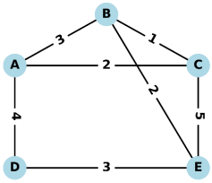 Tại một khu trung tâm dữ liệu, kỹ sư IT cần kiểm tra kết nối giữa các máy chủ trong hệ thống gồm các trạm A, B, C, D, E. Các tuyến cáp quang nối giữa các trạm được biểu diễn trong sơ đồ sau, với con số ghi trên mỗi tuyến là chiều dài dây cáp (đơn vị: km).
