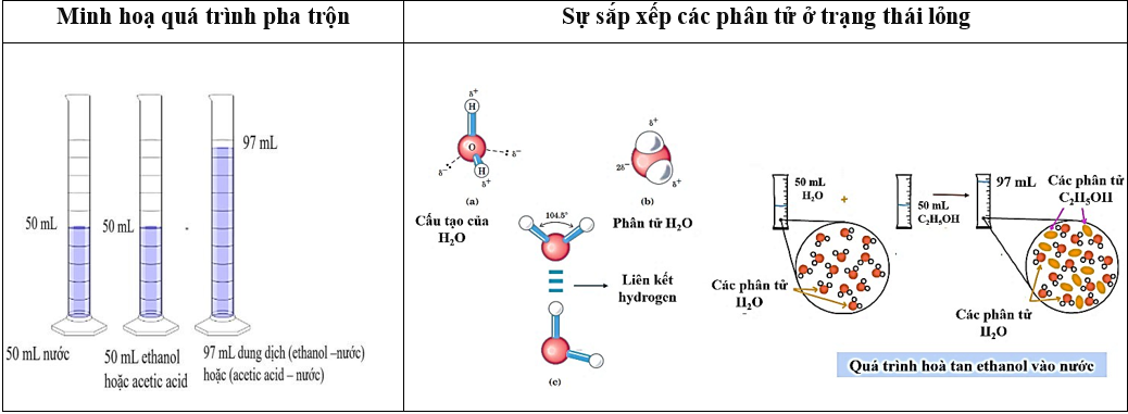 Quan sát hình ảnh minh hoạ, hãy giải thích tại sao tổng thể tích dung dịch sau khi trộn lại giảm còn 97 mL? (Bỏ qua sự bay hơi không đáng kể của các ethanol hoặc acetic acid).