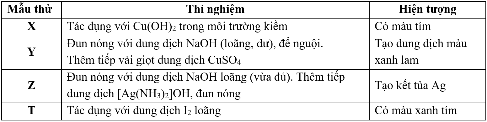 Tiến hành thí nghiệm với các chất X, Y, Z, T. Kết quả được ghi ở bảng sau: