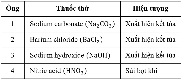 Một mẫu nước được thử nghiệm định tính để xác định sự có mặt của một số ion. Mẫu nước được cho vào 4 ống nghiệm, sau đó nhỏ mỗi loại thuốc thử vào mỗi ống nghiệm và ghi nhận hiện tượng như bảng dưới đây: