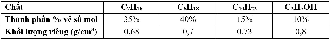 Ta có: Vbiogasonline = $\text{V}_{\text{C}_{7}\text{H}_{16}}$+ $\text{V}_{\text{C}_{8}\text{H}_{18}}$+ $\text{V}_{\text{C}_{10}\text{H}_{22}}$+ $\text{V}_{\text{C}_{2}\text{H}_{5}\text{OH}}$