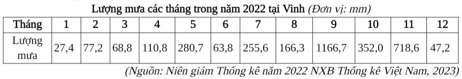 Căn cứ vào bảng số liệu trên, cho biết tháng mưa nhiều nhất ở Vĩnh năm 2022 gấp bao nhiêu lần tháng mưa ít nhất? (làm tròn kết quả đến một chữ số thập phân).