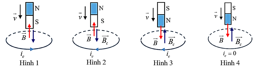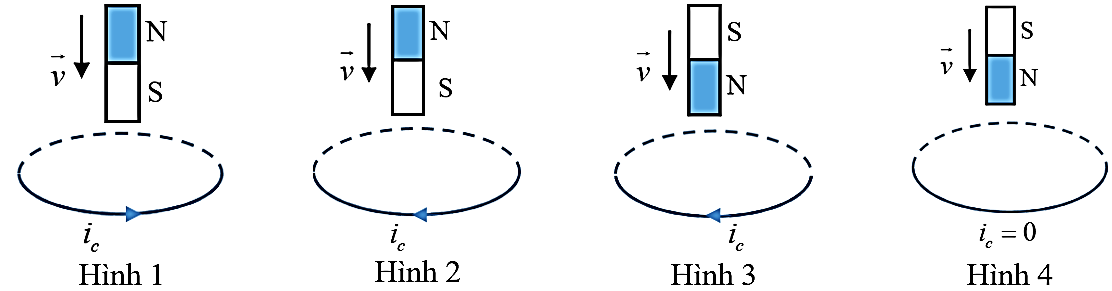 Hình nào sau đây biểu diễn đúng chiều của dòng điện cảm ứng $i_{c}$ trong vòng dây dẫn khi cho nam châm rơi tự do đi qua tâm của vòng dây đặt trên bàn?