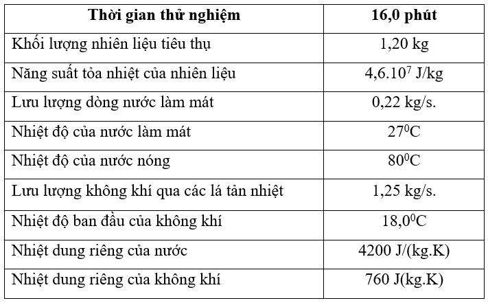 Biết khi nhiên liệu bị đốt cháy hoàn toàn thì 30% nhiệt năng từ nhiên liệu sẽ chuyển hóa thành công có ích, toàn bộ nhiệt lượng do nước tỏa ra khi đi qua bộ tản nhiệt được không khí qua lá tản nhiệt hấp thụ. Căn cứ bảng số liệu và sơ đồ nguyên lí vận hành của hệ thống làm mát có các khẳng định sau: