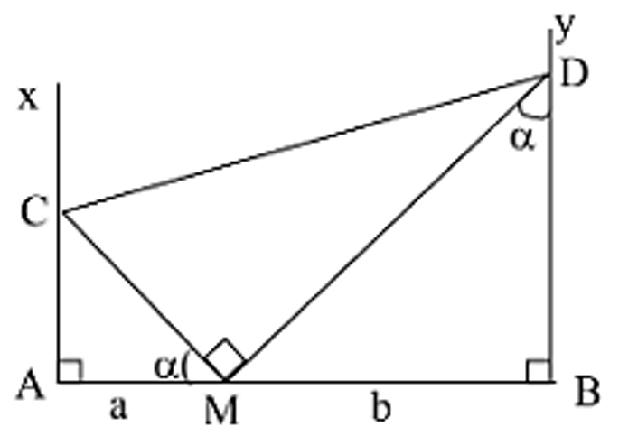 Cho điểm $M$ nằm trên đoạn thẳng $AB$. Vẽ về một phía của $AB$ các tia $Ax,\,\, By$ vuông góc với $AB$. Qua $M$ có hai đường thẳng thay đổi luôn vuông góc với nhau và cắt $Ax,\,\, By$ theo thứ tự tại $C,\,\, D$. Tìm vị trí của $C,\,\, D$ diện tích nhỏ nhất của tam giác $MCD$