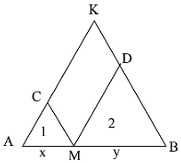 Cho điểm $M$ di chuyển trên đoạn thẳng $AB$. Vẽ các tam giác đều $AMC$ và $BMD$ về một phía của $AB$. Xác định vị trí của $M$ để tổng diện tích hai tam giác đều trên là nhỏ nhất