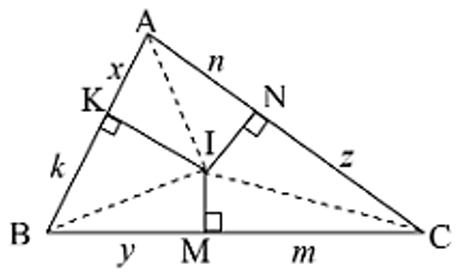 Đặt $BK = k,\,\, CM = m,\,\, AN = n,\,\, BC = a,\,\, AC = b,\,\, AB = c$