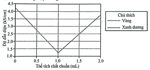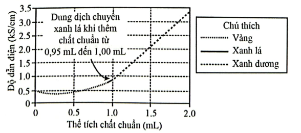 Thêm 1 giọt chi thị nitrazine vàng vào bình tam giác chứa 100 mL dung dịch HCl mẫu. Cho đầu máy đo độ dẫn điện vào lòng dung dịch. Dung dịch NaOH được nhỏ từ từ vào dung dịch. Sau mỗi lần nhỏ, lắc đều dung dịch mẫu, ghi lại màu và độ dẫn điện của dung dịch. Kết quả được tổng hợp trong Hình 1.