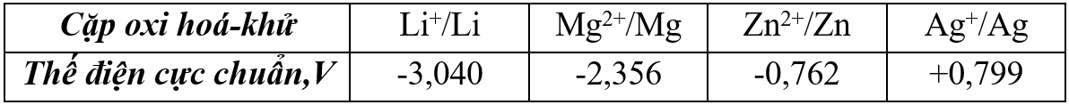 Cho các cặp oxi hoá-khử của các kim loại và thế điện cực chuẩn tương ứng: