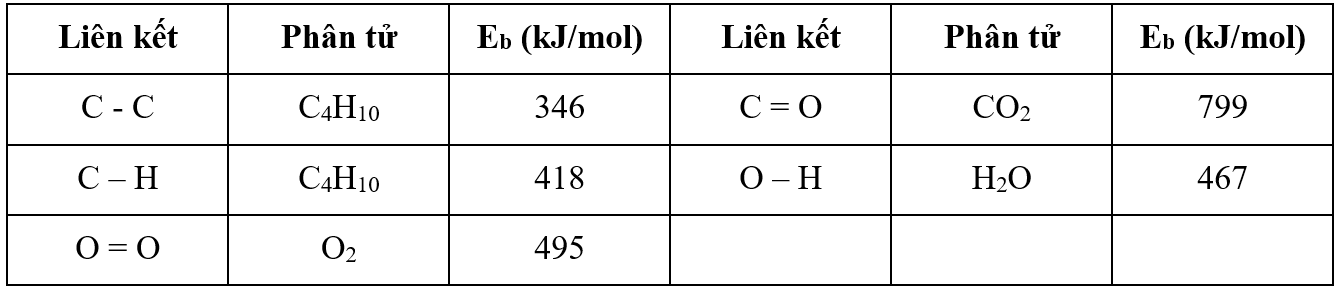 Cho phản ứng đốt cháy butane sau: C4H10(g) + O2(g) ⟶ CO2(g) + H2O(g) Biết năng lượng liên
