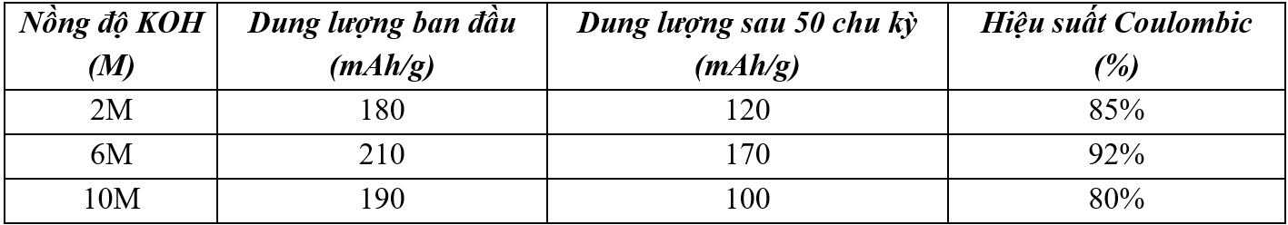 | b) Pin với KOH 6M có hiệu suất cao nhất, dung lượng duy trì tốt sau 50 chu kỳ. | ||