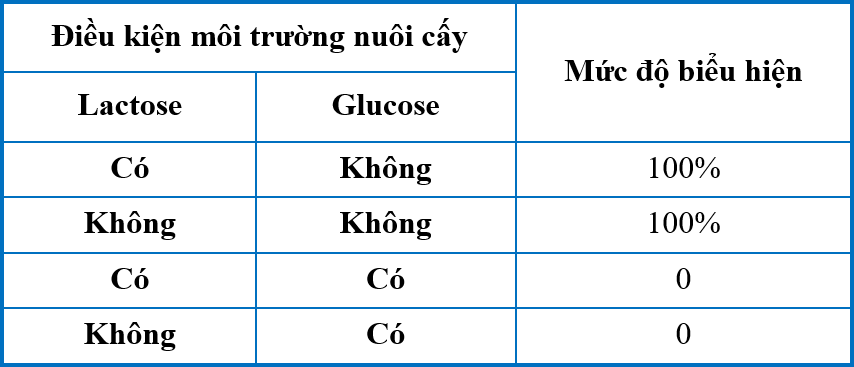 | b) Môi trường dù có hay không có lactose mức độ biểu hiện của operon lac đều không được biểu hiện. | ||