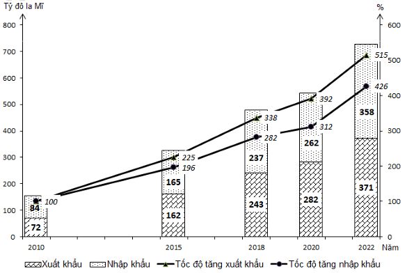 Cho biểu đồ: QUY MÔ VÀ TỐC ĐỘ TĂNG TRƯỞNG TRỊ GIÁ XUẤT KHẨU, NHẬP KHẨUCỦA NƯỚC TA GIAI