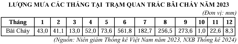 Căn cứ vào bảng số liệu trên, tính tổng lượng mưa các tháng mùa khô tại trạm quan trắc Bãi Cháy năm 2023. (Làm tròn kết quả đến hàng đơn vị của mm).
