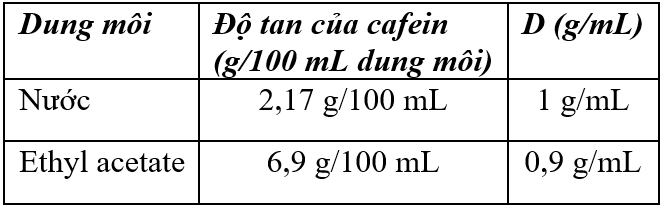 Bảng 1. Độ tan của cafein trong hai dung môi ở nhiệt độ 25°C