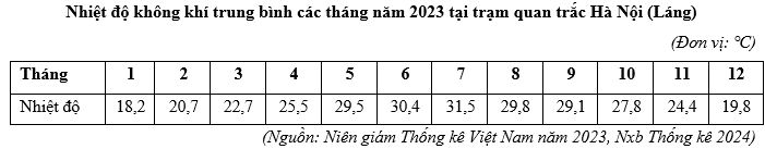 Căn cứ vào bảng số liệu, hãy cho biết biên độ nhiệt độ không khí năm 2023 tại trạm quan trắc Hà Nội (Láng) là bao nhiêu ℃ (làm tròn kết quả đến một chữ số thập phân).