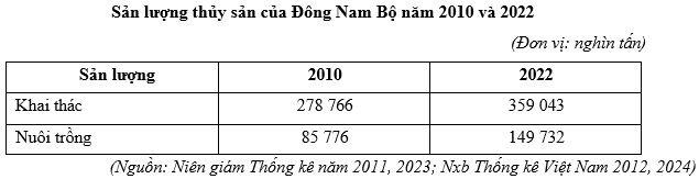 Căn cứ vào bảng số liệu trên, hãy cho biết tỉ lệ sản lượng thủy sản nuôi trồng trong tổng sản lượng thuỷ sản ở Đông Nam Bộ năm 2022 so với năm 2010 tăng bao nhiêu phần trăm (làm tròn kết quả đến một chữ số thập phân).