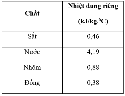 Bảng bên cho biết nhiệt dung riêng của một số chất ở điều kiện bình thường.