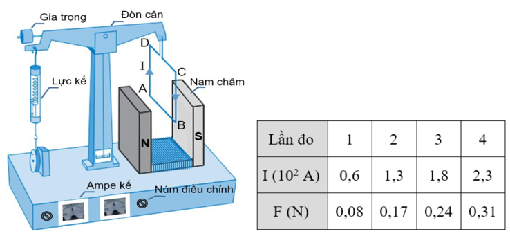 Có thể sử dụng bộ thí nghiệm như hình bên để tìm hiểu về mối liên hệ giữa lực từ tác dụng lên một đoạn dây dẫn đặt trong từ trường đều và cường độ dòng điện chạy qua dây dẫn đó.