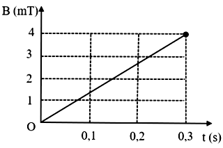 Một khung dây phẳng có diện tích 30 cm2, gồm 50 vòng dây, được đặt trong từ trường đều sao cho mặt phẳng khung dây luôn vuông góc với các đường sức từ. Đồ thị bên biểu diễn sự thay đổi của độ lớn cảm ứng từ B theo thời gian t. Độ lớn của suất điện động cảm ứng xuất hiện trong khung dây từ thời điểm 0 s đến thời điểm 0,3 s là bao nhiêu milivôn?