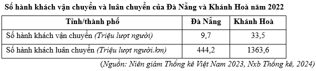 Căn cứ vào bảng số liệu trên, hãy cho biết cự li vận chuyển hành khách trung bình của Đà Nẵng cao hơn cự li vận chuyển hành khách trung bình của Khánh Hòa là bao nhiêu km (làm tròn kết quả đến một chữ số thập phân).