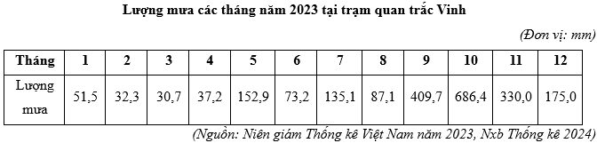 Căn cứ vào bảng số liệu trên, hãy cho biết lượng mưa trung bình các tháng từ tháng 9 đến tháng 12 năm 2023 tại trạm quan trắc Vinh là bao nhiêu mm (làm tròn kết quả đến hàng đơn vị).
