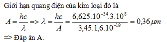 Công thoát êlectron ra khỏi một kim loại là A = 3,45 eV. Giới hạn quang điện của kim loại đó là