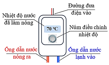 Hình bên là sơ đồ nguyên lí hoạt động của một máy làm nóng nước có dung tích 20 lít và công suất tiêu thụ điện 2500 W. Vào một ngày mùa đông khi bật máy nhiệt độ nguồn nước lạnh đưa vào là $18^{0}C$, khi nước đã được làm nóng đến nhiệt độ tối đa là $70^{0}C$ thì rơ le của máy tự ngắt (trong quá trình này ống dẫn nước nóng ra đang khóa). Nước có khối lượng riêng $\rho = 1000\text{kg/m}^{\text{3}},$ nhiệt dung riêng $c = 4180\,\,\text{J/kg}\text{.K}\text{.}$ Hiệu suất làm nóng nước của máy là $H = 95\%.$
