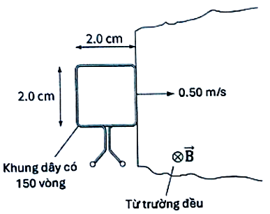 Một khung dây hình vuông có 150 vòng dây được đưa vào vùng không gian có từ trường đều với cảm ứng từ 0,30 T sao cho các đường sức từ vuông góc với mặt phẳng của khung dây (Hình vẽ). Biết mỗi cạnh của khung dây có độ dài 2,0 cm và khung dây được dịch chuyển với tốc độ không đổi bằng 0,50 m/s.