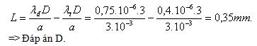 Trong thí nghiệm Young về giao thoa với ánh sáng trắng (có bước sóng từ 0,40 µm đến 0,75 µm): biết khoảng cách giữa hai khe hẹp là 3 mm, khoảng cách từ hai khe đến màn hứng vân là 3 m. Bề rộng của dải quang phổ ngay sát vân sáng trắng trung tâm là