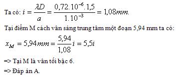 Trong thí nghiệm Young về giao thoa ánh sáng: biết khoảng cách giữa hai khe hẹp là 1 mm, khoảng cách từ hai khe đến màn hứng vân là 1,5 m, ánh sáng sử dụng có bước sóng 0,72 µm. Tại điểm M cách vân sáng trung tâm một đoạn 5,94 mm sẽ có