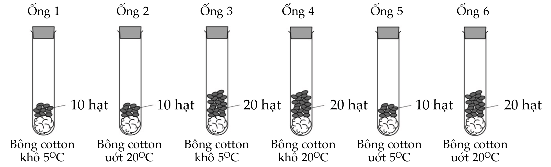 Một thí nghiệm sử dụng các hạt đậu đựng trong 6 ống nghiệm như hình dưới. Muốn đánh giá sự ảnh hưởng của nhiệt độ lên sự nảy mầm cần so sánh hai ống nghiệm nào sau đây?