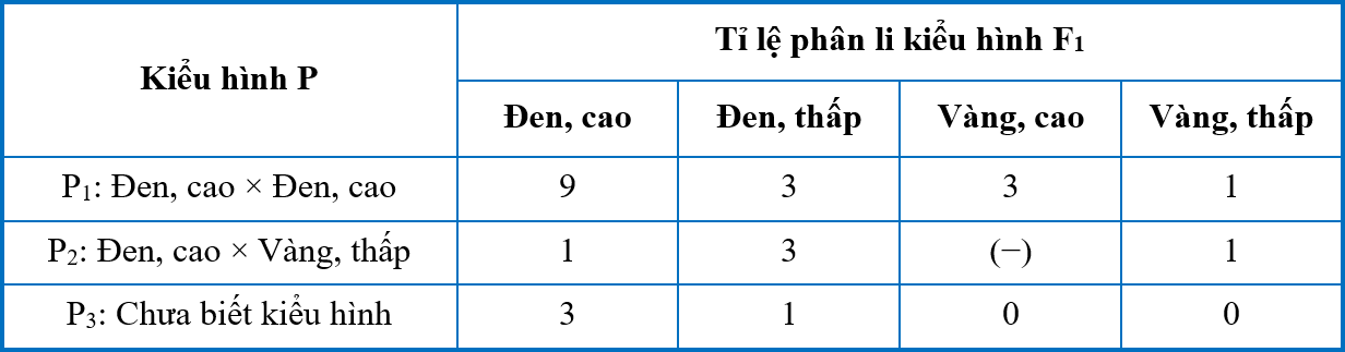 Ở một loài động vật, xét hai tính trạng màu lông và chiều cao chân. Mỗi tính trạng do một gene có hai allele trội lặn hoàn toàn, nằm trên NST thường quy định. Thực hiện các phép lai (P1, P2, P3) mỗi phép lai giữa hai cá thể cùng loài và thu được kết quả mô tả ở bảng dưới đây. Biết rằng, ở F1 của P2 có 4 loại kiểu hình, tỉ lệ kiểu hình lông vàng, chân cao không được thể hiện ở bảng bên và kí hiệu là (−)