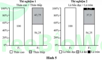 Ở một loài thực vật có hoa, xét hai tính trạng là chiều cao thân và hình dạng lá; mỗi tính trạng do 2 cặp gene quy định, các gene quy định các tính trạng phân li độc lập với nhau. Các nhà khoa học đã tiến hành nghiên cứu hai tính trạng trên để xác định quy luật di truyền đã chi phối. Khi cho lai các dòng thuần có kiểu hình khác nhau thu được những kết quả như Hình 5.