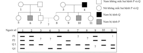 Theo dõi sự di truyền của hai bệnh P và Q trong một gia đình. Cho biết không xảy ra đột biến và bệnh P do gene có 2 allele là P1 và P2 quy định; bệnh Q do 2 allele Q1 và Q2 quy định. Mẫu DNA của mỗi cá thể trong gia đình được xử lí để cắt locus gene P và Q ra khỏi hệ gene, sau đo khuếch đại bằng phương pháp PCR. Các sản phẩm PCR được tinh sạch và tiến hành phân tích bằng phương pháp điện di. Sơ đồ phả hệ và kết quả điện di được mô tả ở Hình 9.
