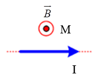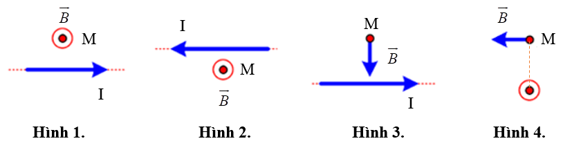 Hình vẽ nào dưới đây xác định sai hướng của vecto cảm ứng từ $\overset{\rightarrow}{B}$ tại M gây bởi dòng điện I trong dây dẫn thẳng dài vô hạn?